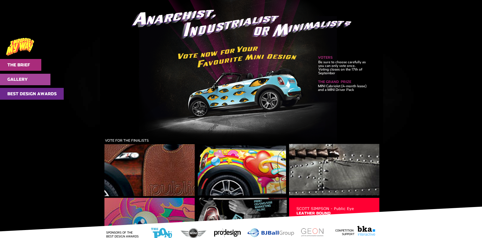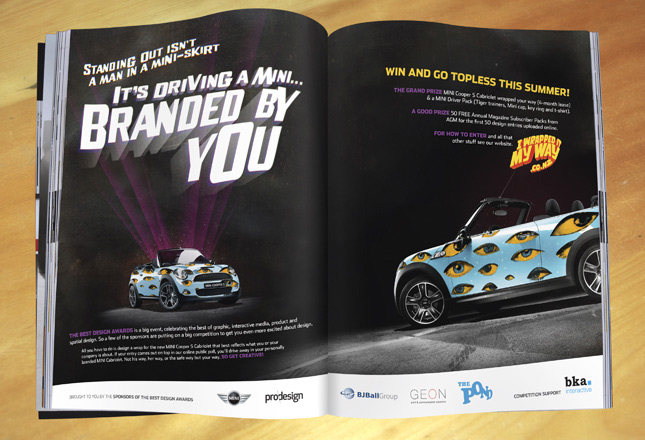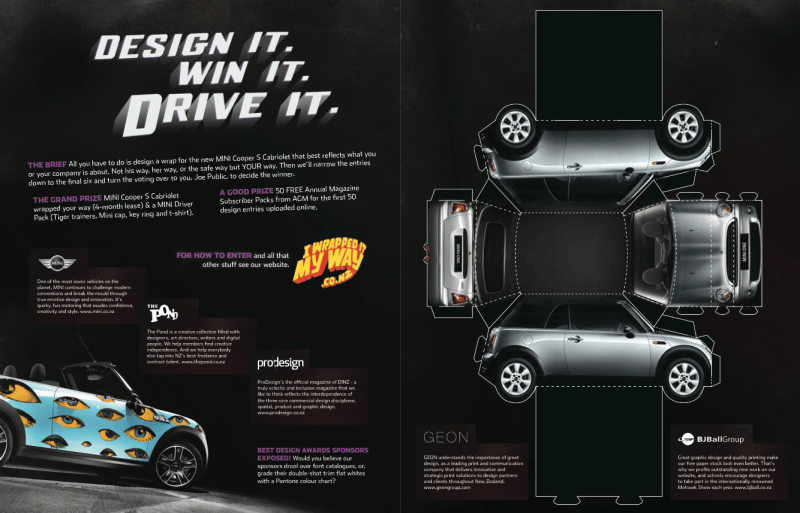 As the overall project manager I worked with a number of partners to get this competition up and running. I collaborated with BKA to build the microsite, BJ Ball for the promotional DM, ProDesign for ad placements within their magazines, GEON to produce the winning wrap, and MINI on the awards ceremony venue. I also worked with Pond Art directors, Copywriters and Designers to come up with the look and feel of the campaign, as well as its various promotional elements.