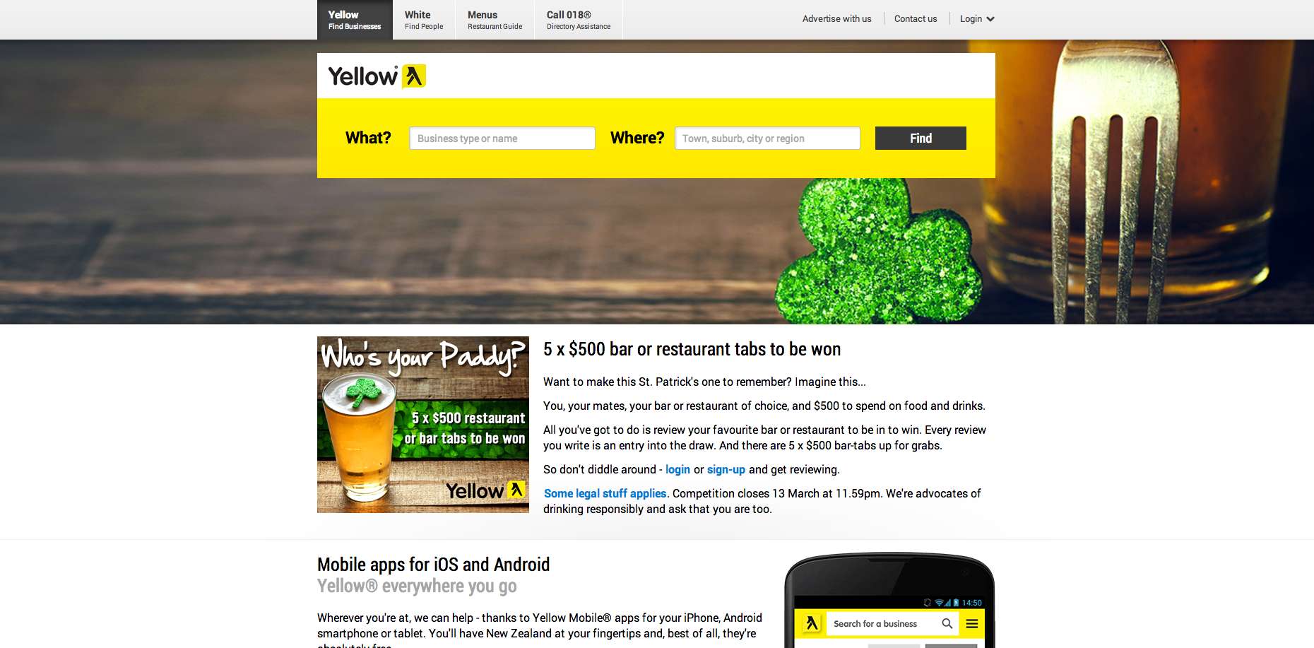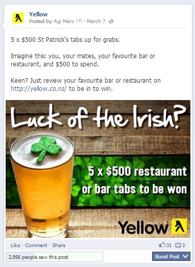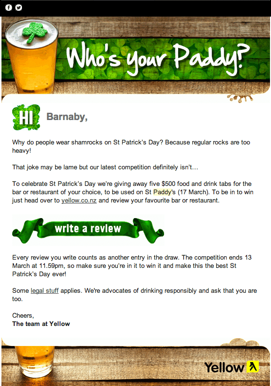 Use St Patrick’s Day as a timely excuse and give people a chance to win one of 5 x $500 bar tabs at a place of their choice. Then use a concoction of social media, digital banners, retargeting and eDMs to promote the competition.